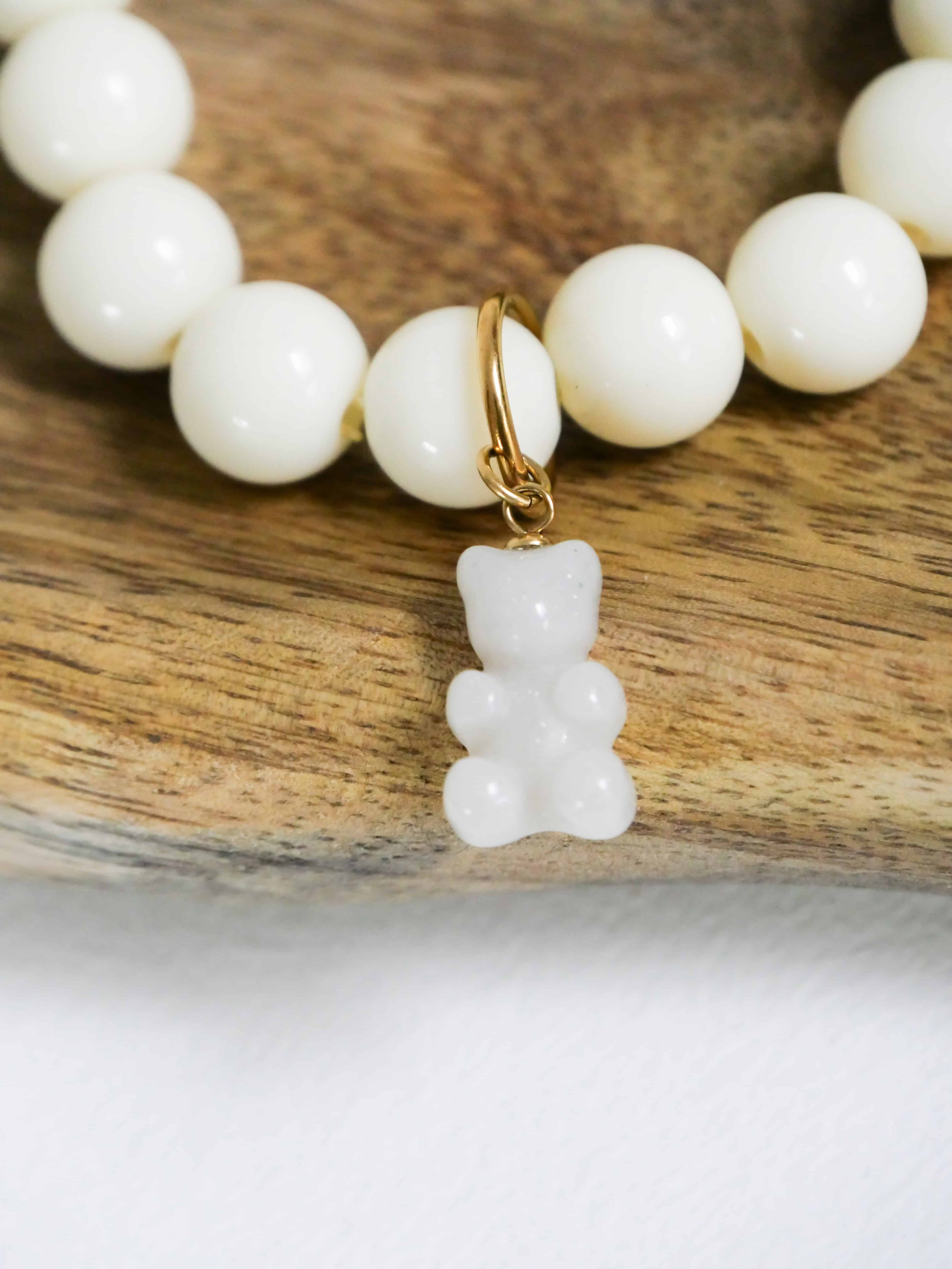 Perles blanches et ourson vintage. Le blanc indémodable qui va avec tout.